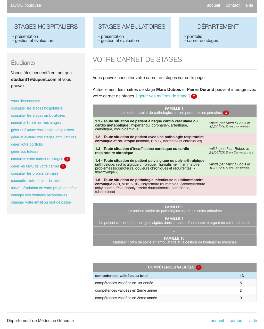 Le maître de stage doit d'abord choisir l'étudiant dont il veut voir le portfolio. La liste de ses étudiants s'affiche (2), ensuite il peut cliquer sur le bouton "carnet" (3) pour se rendre sur le carnet de stages de l'étudiant.