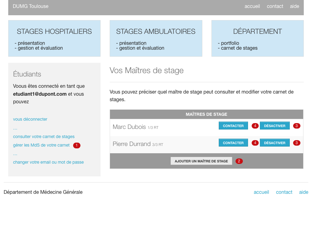 Un étudiant peut ajouter (2) un maître de stage. Un étudiant peut désactiver (3) un maître de stage afin de lui retirer la possibilité de modifier les informations du carnet. Il peut également contacter (4) un maître de stage dans la liste à l'aide d'un petit formulaire.