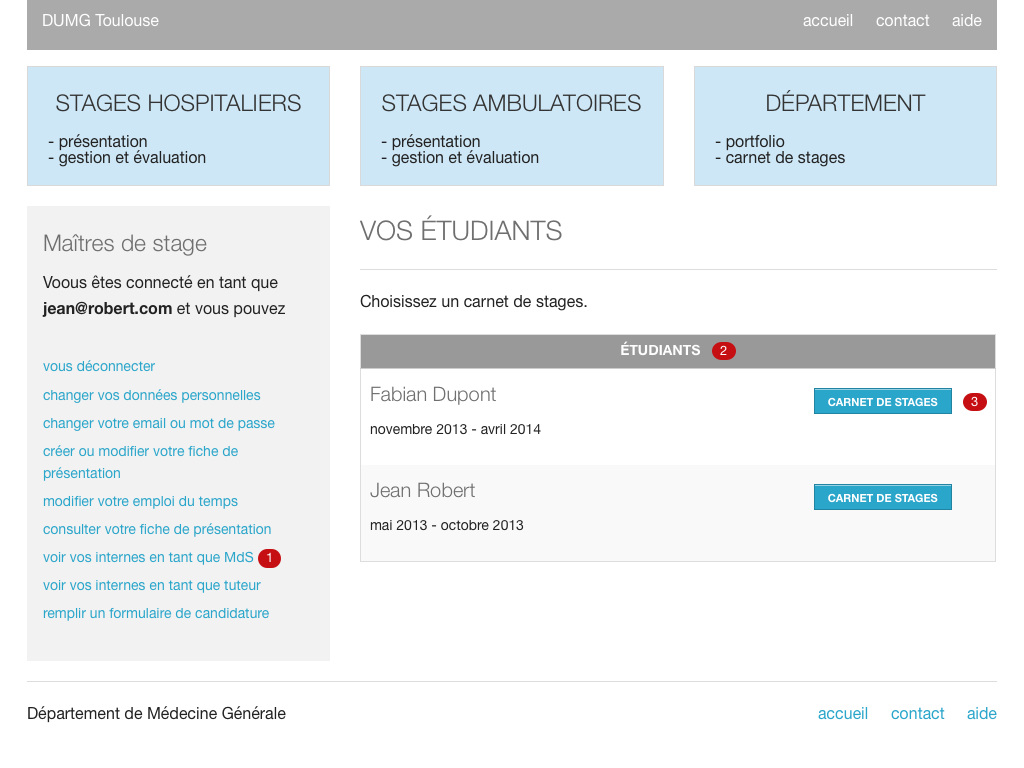 La navigation principale et le "menu contextuel" permettent à un maître de stage de se rendre dans la section "Carnet de stages" du site. (1)