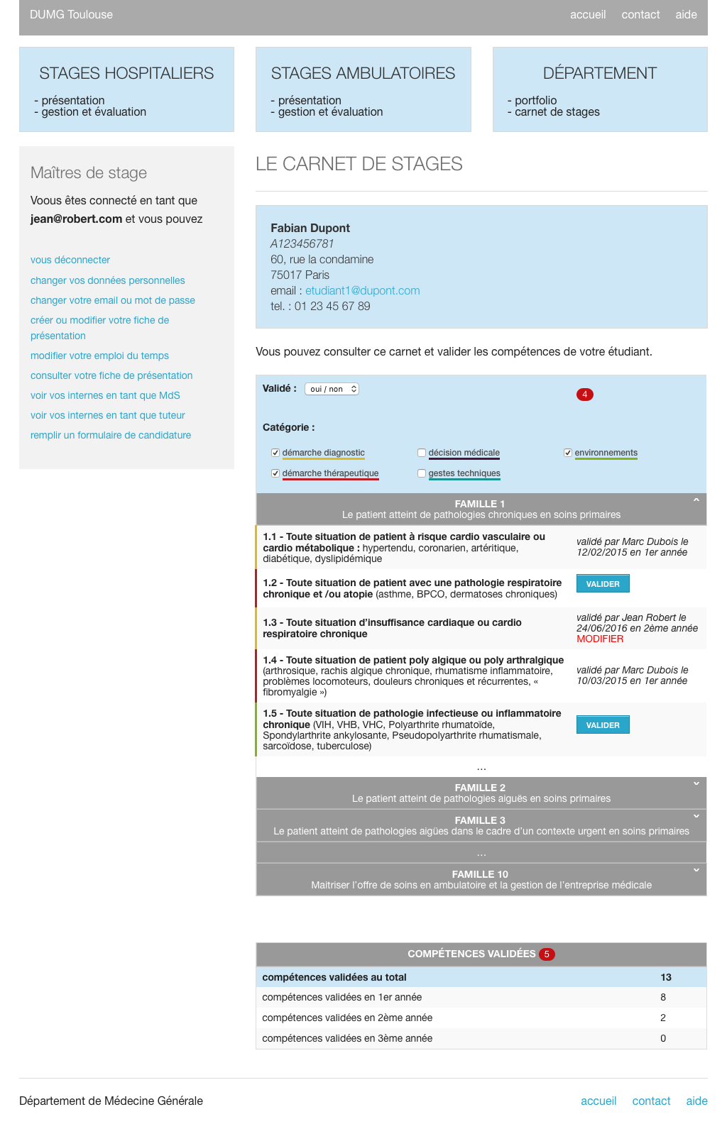 La section du carnet de stage s'intègre au site internet actuel du DUMG afin de pouvoir utiliser le système d'identification actuel et afin de regrouper toutes les informations en un seul endroit.